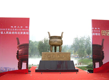 2007年10月13日,北京奧運會倒計時300天,北京朝陽公園里彩旗飄飄,彩球高懸,到處洋溢著歡慶的氣氛。上午10時,由國家文化產(chǎn)業(yè)示范基地山西宇達集團精心鑄造、甘肅省人民政府贈送給北京奧組委的青銅《奧運盛鼎》在這里舉行隆重的捐贈揭幕儀式。著名歌唱家郭蓉的一曲《紅旗飄飄》把整個活動推向高潮。北京奧組委執(zhí)行副主席蔣效愚,甘肅省副省長馮健身以及300名大學(xué)生奧運志愿者和千余名熱心中外觀眾參加了揭幕慶典。北京奧組委執(zhí)行副主席蔣效愚在致辭中說,《奧運盛鼎》的捐贈活動有益于彰顯中華民族燦爛文化,弘揚奧林匹克精神,展示中國改革開放、國泰民安的良好形象,表達了全國各族人民關(guān)心、支持北京奧運會的美好心愿?!秺W運盛鼎》將臨時安放在朝陽公園西門內(nèi)的霧泉廣場,奧運會開幕前將遷至奧林匹克中心區(qū),成為區(qū)中的獨特景觀。中央電視臺等各大媒體紛紛報道……巍巍青銅重器,見證著中華百年奧運夢圓,也見證著華夏兒女對百年奧運的熱切期盼。這一堪稱經(jīng)典的2008奧運會主題青銅禮器震撼著人們的心。