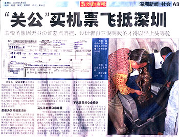本報(bào)訊(記者豐雪) 由山西宇達(dá)集團(tuán)公司設(shè)計(jì)制作并推出的關(guān)公圣像第0001號(hào)本月15日抵達(dá)深圳。昨日,來(lái)自深圳的吳肇釗先生稱,他特意說服航空公司的工作人員,開先河買機(jī)票讓關(guān)公圣像0001號(hào)乘坐飛機(jī)頭等艙來(lái)到深圳。由西安咸陽(yáng)機(jī)場(chǎng)起飛的機(jī)票顯示,旅客名稱為關(guān)帝圣像0001號(hào)。
