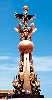 2001年4月,皖南秀美瑰麗的江城蕪湖市,一座高達(dá)35米的青銅巨雕《鳩頂澤瑞》在市中心廣場(chǎng)拔地而起。遠(yuǎn)遠(yuǎn)望去,象征大開(kāi)放的蕪湖在新世紀(jì)振翅騰飛的鳩鶿凌空翱翔;步入廣場(chǎng),巨型青銅雕塑的宏偉氣勢(shì)令人蕩氣回腸,震憾不已。這尊堪稱(chēng)中國(guó)青銅城市雕塑之最的杰作,由中國(guó)著名藝術(shù)家韓美林設(shè)計(jì),由我國(guó)青銅藝術(shù)鑄造專(zhuān)業(yè)化的山西宇達(dá)集團(tuán)公司運(yùn)用高新技術(shù)制造并安裝。