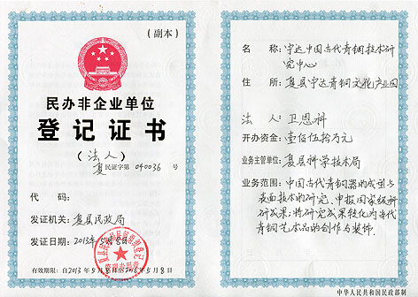 宇達(dá)中國古代青銅技術(shù)研究中心登記證書