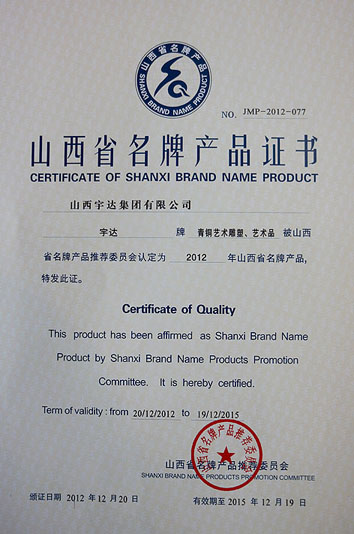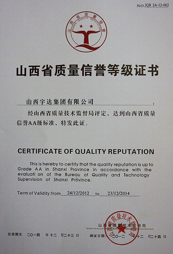 宇達榮獲"山西省名牌產(chǎn)品"稱號及"山西省質(zhì)量信譽AA級"榮譽