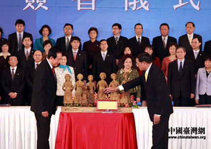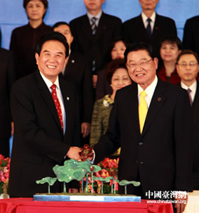 2010年12月21日下午,海協(xié)會(huì)會(huì)長陳云林與?;鶗?huì)董事長江丙坤正式簽署《海峽兩岸醫(yī)藥衛(wèi)生合作協(xié)議》,雙方并在協(xié)議簽署后互贈(zèng)禮品。圖為?;鶗?huì)致贈(zèng)海協(xié)會(huì)方面的陶土作品《齊心傳唱 和諧天籟》。 兩岸兩會(huì)領(lǐng)導(dǎo)人第六次會(huì)談21日在臺(tái)北舉行,海協(xié)會(huì)會(huì)長陳云林和?;鶗?huì)董事長江丙坤于當(dāng)天下午正式簽署《海峽兩岸醫(yī)藥衛(wèi)生合作協(xié)議》。協(xié)議簽署后,雙方互贈(zèng)紀(jì)念品。 海基會(huì)致贈(zèng)海協(xié)會(huì)方面的禮品是名為《齊心傳唱 和諧天籟》的一組陶土雕塑作品。海協(xié)會(huì)回贈(zèng)?;鶗?huì)方面的是一尊蓮花造型雕塑《好事連連》,寄托對(duì)兩岸關(guān)系和平發(fā)展的款款美意。(特派記者 李徽) (來源:中國臺(tái)灣網(wǎng)) | |